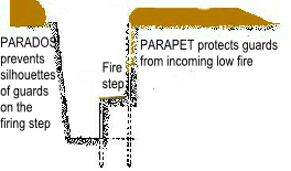 The ground where you are standing slopes gently away from the edge of the trench and forms a protective barrier to incoming fire. This is known as a parapet. The rear, higher bank is called a parados.