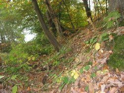 Norsey Wood possesses excellent examples of such systems, uniquely called Deerbank. Before the 1930s, these surrounded the whole wood. Today, owing to residential development along Norsey Road, which also destroyed one of the Bronze Age burial mounds, the Deerbank is fragmented. Happily, it remains still to be seen on the present eastern, southern and western boundaries. It can be viewed most easily from the Easy Access Trail by walking in an anti-clockwise direction from the Information Centre. It becomes visible on the left as soon as the entrance gate from Break Egg Hill is reached. This particular part of the Deerbank is a later construction than the original and is superimposed on the older one. If the path is followed beyond where the Easy Access Trail turns off to the right and down the slope, the bank divides in two and the northern of the two divides again, indicating three phases of construction. Two of these banks (the most southerly) possess obvious external ditches; one has evidence of an internal ditch as well (the path follows this ditch going uphill from the Larch plantation. The side on which the ditch is found is the side where the deer or cattle would have been. With a paling fence on top, the bank with its deep ditch would have been a formidable barrier for the animals to leap.